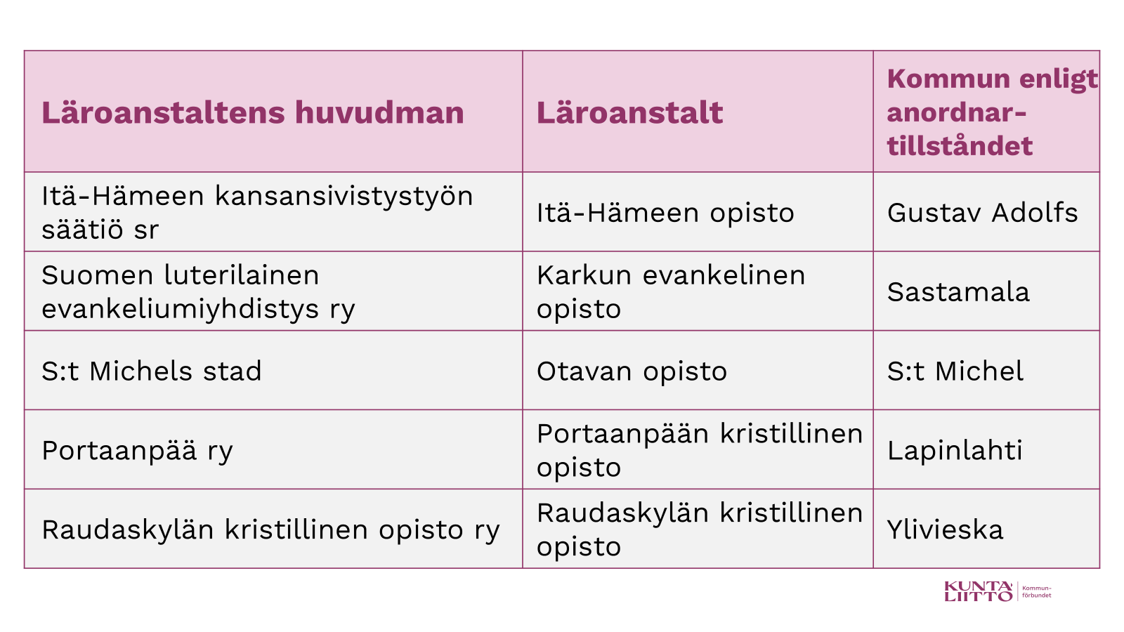 Figur 1: Huvudmännen för de folkhögskolor som tillhandahåller gymnasieutbildning, läroanstalterna och kommunerna inom vars område denna utbildning får ordnas.