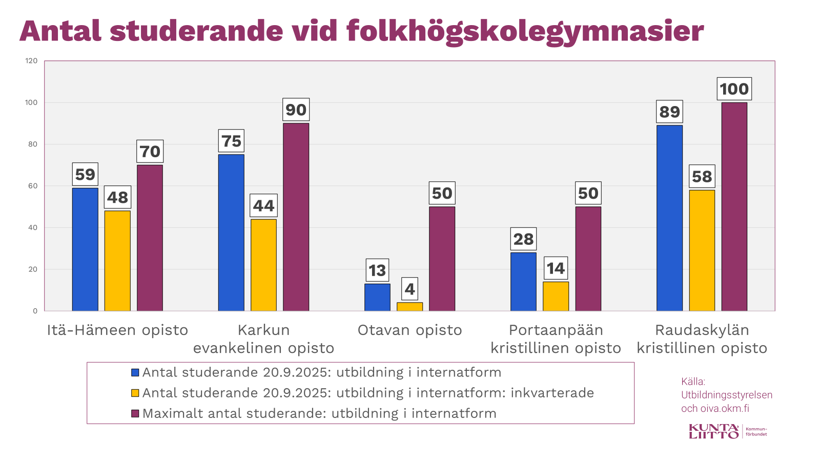Figur 3: Det totala antalet studerande i folkhögskolegymnasiernas gymnasieutbildning i internatform och antalet inkvarterade studerande som deltar i studierna 20.9.2025 samt det maximala antalet studerande enligt anordnartillståndet.