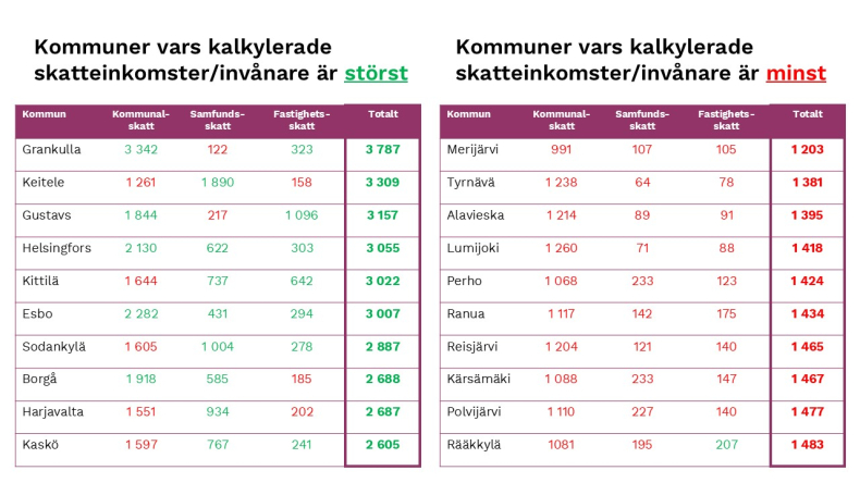 Kommunernas skatteinkomster skiljer sig betydligt från varandra, liksom också deras ekonomiska utmaningar. Den minskande nativiteten, befolkningens stigande ålder, den koncentrerade invandringen och urbaniseringen medför egna utmaningar för alla typer av kommuner. Skillnader i skatteinkomster betyder inte nödvändigtvis att en kommun är sämre eller bättre än en annan ur ekonomisk synvinkel. Alla kommuner har egna styrkor. Men om olikhet leder till oskäliga skillnader i skattesatserna, måste man fundera på lösningar.