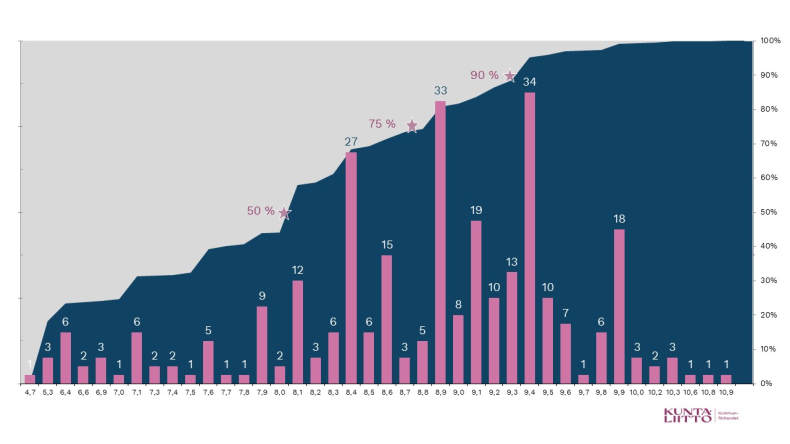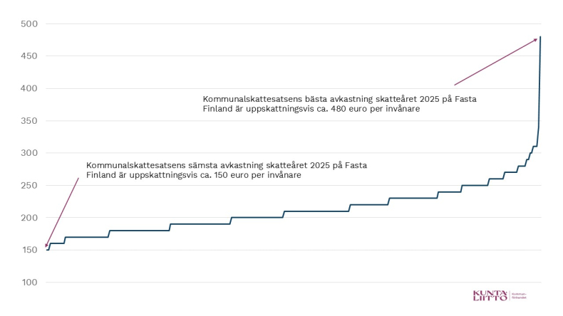 Figur 3. Uppskattade intäkter av en kommunalskatteprocent skatteåret 2025, kommunerna på fastlandet. Intäktsskillnaden mellan högsta och lägsta skattesats (euro/invånare) är mer än tredubbel.