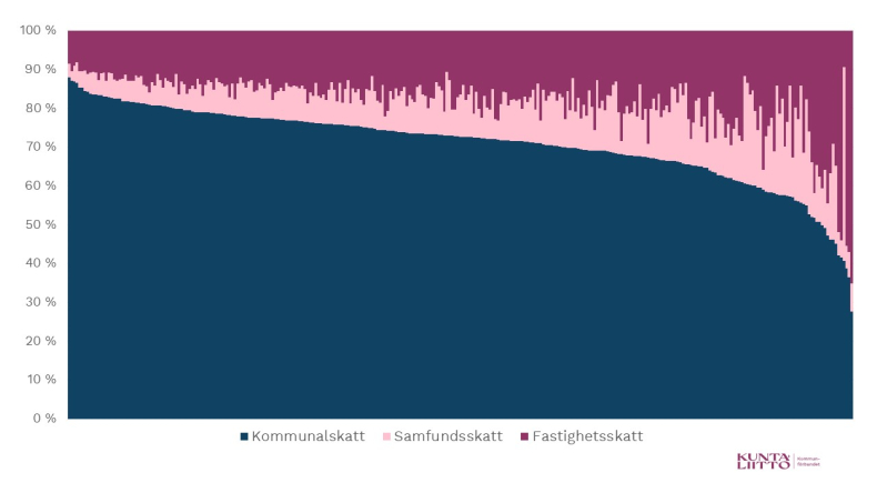 Det finns också stora skillnader mellan kommunerna i fråga om de olika skatteslagens andelar. På riksnivå är kommunalskattens andel av kommunernas alla skatteinkomster den klart största, cirka 70 procent år 2024. Samfundsskattens andel är cirka 13 procent och fastighetsskattens cirka 17 procent. Till exempel i Gustavs och Pelkosenniemi, där det finns många fritidsbostäder, utgör fastighetsskatteinkomsterna rentav cirka 60 procent av kommunens totala skatteinkomster. Samtidigt finns det kommuner vars samfundsskatteinkomster utgör nästan en tredjedel eller rentav hälften av kommunens samtliga skatteinkomster. Kommunalskatten är i vilket fall som helst det mest betydande skatteslaget i de flesta kommuner.