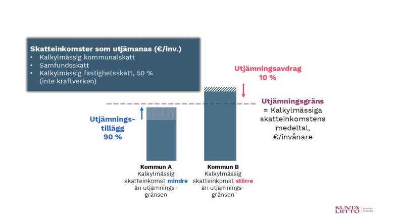 Det kommunvisa utjämningsbeloppet baserar sig på hur mycket kommunens kalkylerade skatteinkomster per invånare skiljer sig från genomsnittet för kommunerna på fastlandet. Om de kalkylerade skatteinkomsterna per invånare ligger under utjämningsgränsen, får kommunen ett utjämningstillägg som är 90 procent av skillnaden mellan kommunens kalkylerade skatteinkomster och utjämningsgränsen. Om de kalkylerade skatteinkomsterna däremot ligger över utjämningsgränsen görs ett utjämningsavdrag från kommunens statsandel. Utjämningsavdraget är 10 procent av det belopp som överstiger utjämningsgränsen.