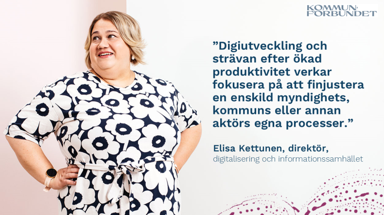 I centrum för debatten kring digitaliseringen står för närvarande produktiviteten. Digi-utvecklingen och strävan efter ökad produktivitet verkar fokusera på att finjustera en enskild myndighets, kommuns eller annan aktörs egna processer. Om man inte ens försöker gå mot en systemmässig och därmed mer komplex förändring, kommer fördelarna att bli blygsamma.