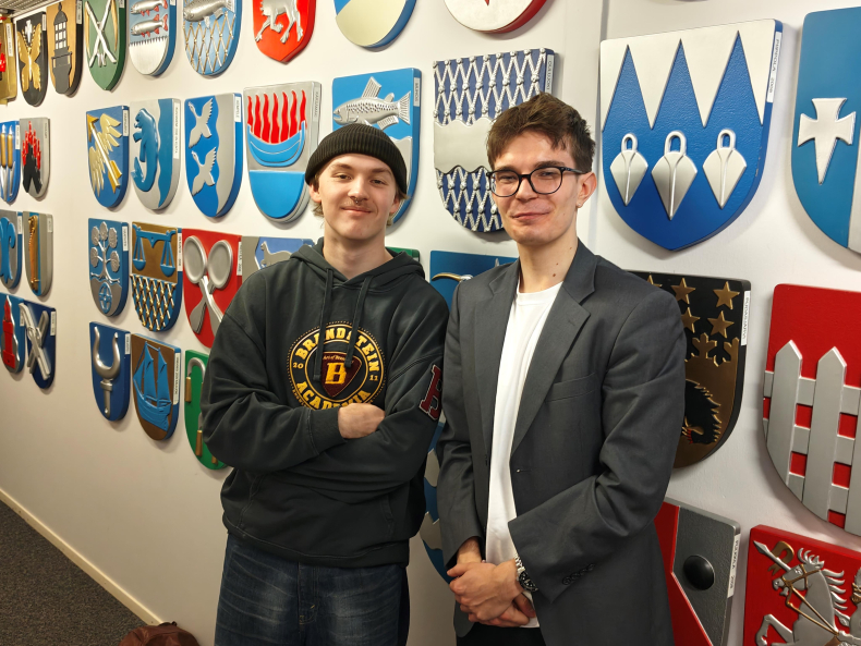 Figur 4: Pietari Meriläinen, ordförande för Suomen Lukiolaisten Liitto 2026, och Veikka Ormio, ordförande 2025, i Kommunförbundets vapenkorridor