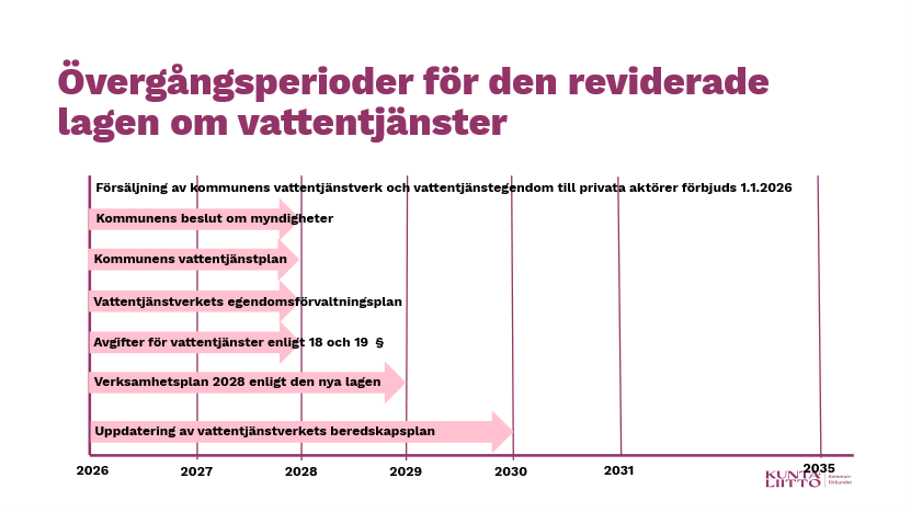Den reviderade lagen om vattentjänster (119/2001) trädde i kraft den 1 januari 2026. Samtidigt trädde statsrådets helt nya förordning om vattentjänster (1173/2025) i kraft, som särskilt preciserar den reviderade lagens bestämmelser om planeringsskyldighet, informationsskyldighet och skyldighet att lämna uppgifter. Paragrafen med lagens syfte har preciserats så att den separat lyfter fram vattentjänsternas driftsäkerhet och att syftet är att kvalitetskraven och kvalitetsmålen enligt hälsoskyddslagen (763/1994) ska uppfyllas för hushållsvatten.