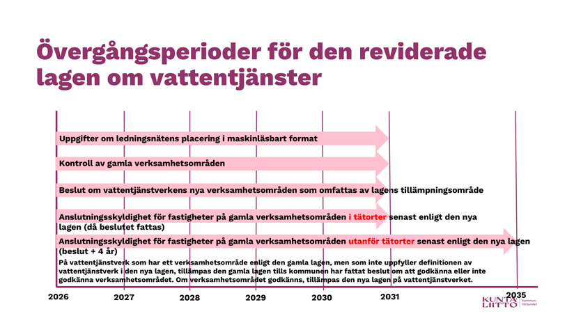 Ändringen av anslutningsskyldigheten träder i kraft då kommunen har kontrollerat vattentjänstverkenas verksamhetsområden i enlighet med den reviderade lagen, dvs. senast den 31 december 2030 beroende på när verksamhetsområdet kontrolleras. Utanför tätorter träder ändringen av anslutningsskyldigheten dock i kraft först fyra (4) år efter beslutet om verksamhetsområde ovan, om området redan tidigare har hört till verksamhetsområdet enligt den tidigare lagen.