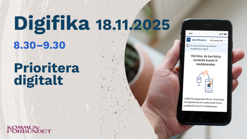 Välkommen till Digifika i november med tema "Prioritera digitalt". Från 2026 är utgångspunkten i kommunikationen med invånare att den sker digitalt, och för att stöda detta genomför DVV ett projekt för expandering av användning av tjänsten för Suomi.fi-meddelanden.