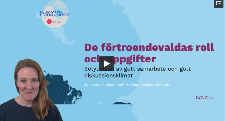 Vad ska jag som förtroendevald veta och var hittar jag mera information? Vi behandlar grunderna i den förtroendevaldas roll och uppgifter. Vi lyfter också upp betydelsen av ett gott samarbete och ett gott diskussionsklimat i kommunen.