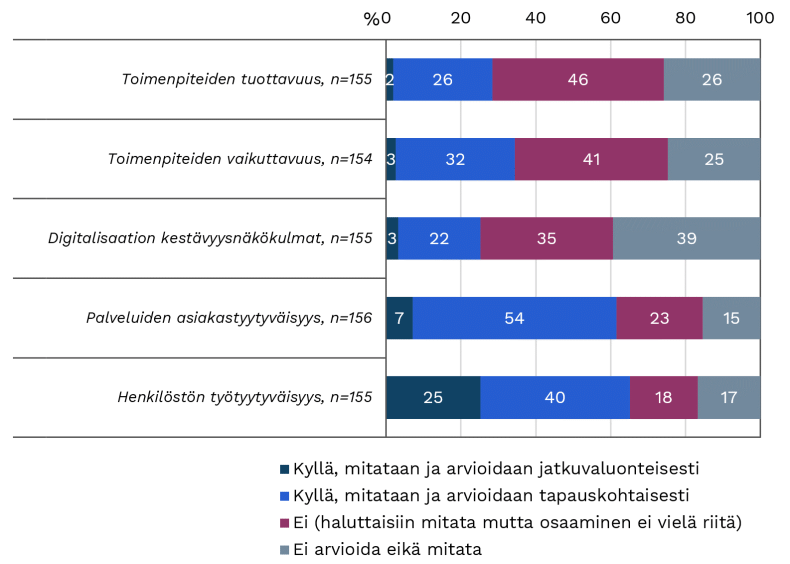 Effekterna av digitaliseringen av tjänster och verksamhet mäts i ett mycket större antal kommuner i samband med mätning av kundnöjdhet med tjänster och personalens arbetstillfredsställelse. Digitaliseringens inverkan mäts som en del av kundnöjdheten med tjänsterna på löpande basis i 7% av kommunerna och på ad hoc-basis i 54% av kommunerna. Digitaliseringens inverkan mäts som en del av personalnöjdheten på löpande basis i 25% av kommunerna och på ad hoc-basis i 40% av kommunerna.
